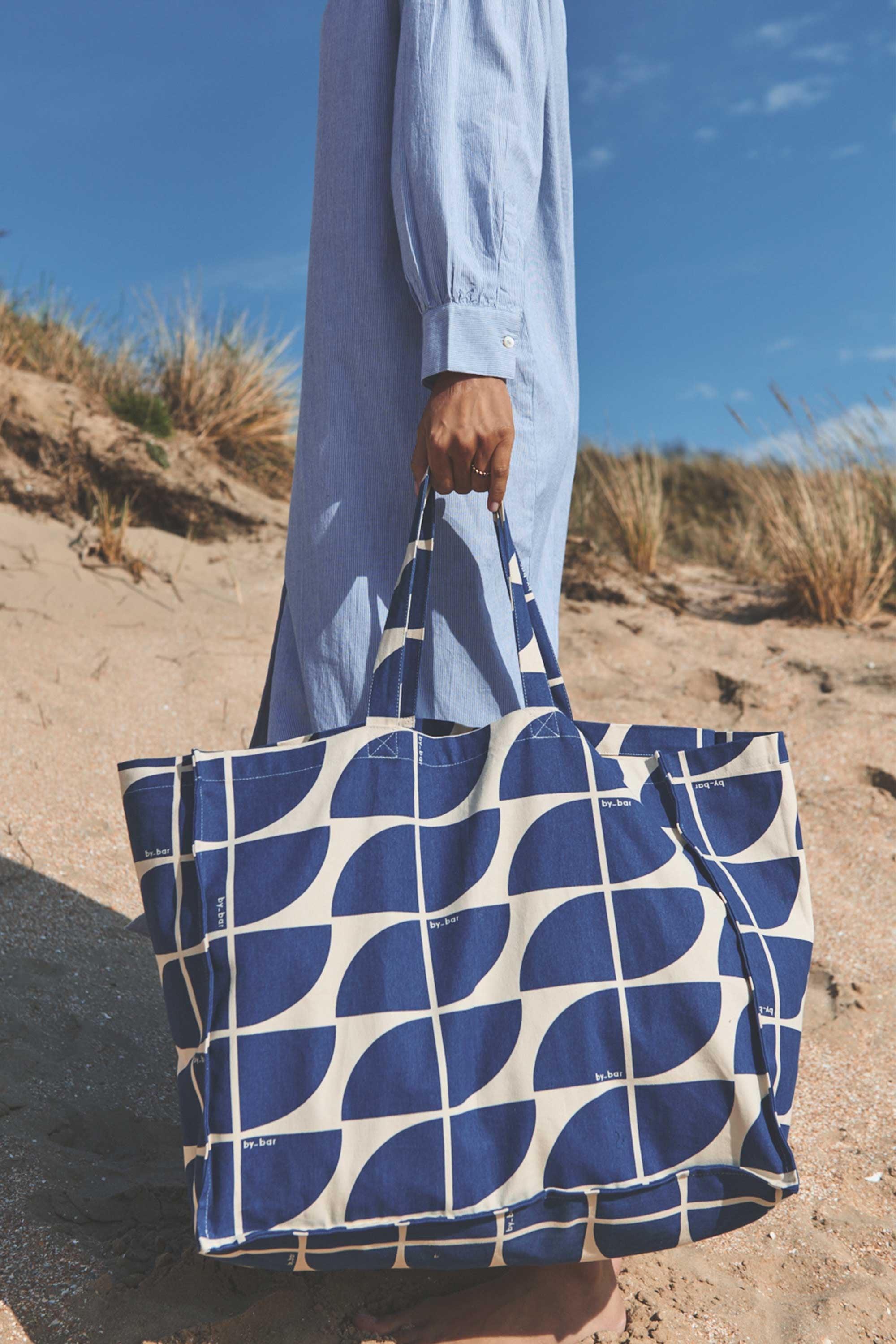 Die geräumige Tasche verfügt über zwei praktische Henkel an der Oberseite, sodass sie bequem in der Hand oder über der Schulter getragen werden kann. Der All-over-Print mit dem neuen by-bar Logo verleiht der Tasche einen stilvollen und zeitgemäßen Look. Damit ist sie die perfekte Go-to-Bag für Alltag, Shopping oder den Strand.