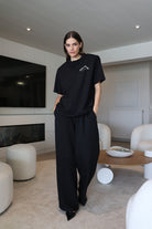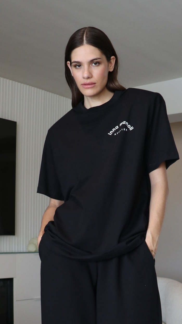 Das klassische Schwarz wird durch das geschwungene Inna-Manoli-Logo auf der Vorderseite akzentuiert und macht das Shirt zu einem subtilen Statement-Piece. Mit seinem relaxed Oversized-Schnitt lässt es sich vielseitig stylen – ob casual zur Jeans, edel zu Wide-Leg-Hosen oder lässig über einen Rock getragen.