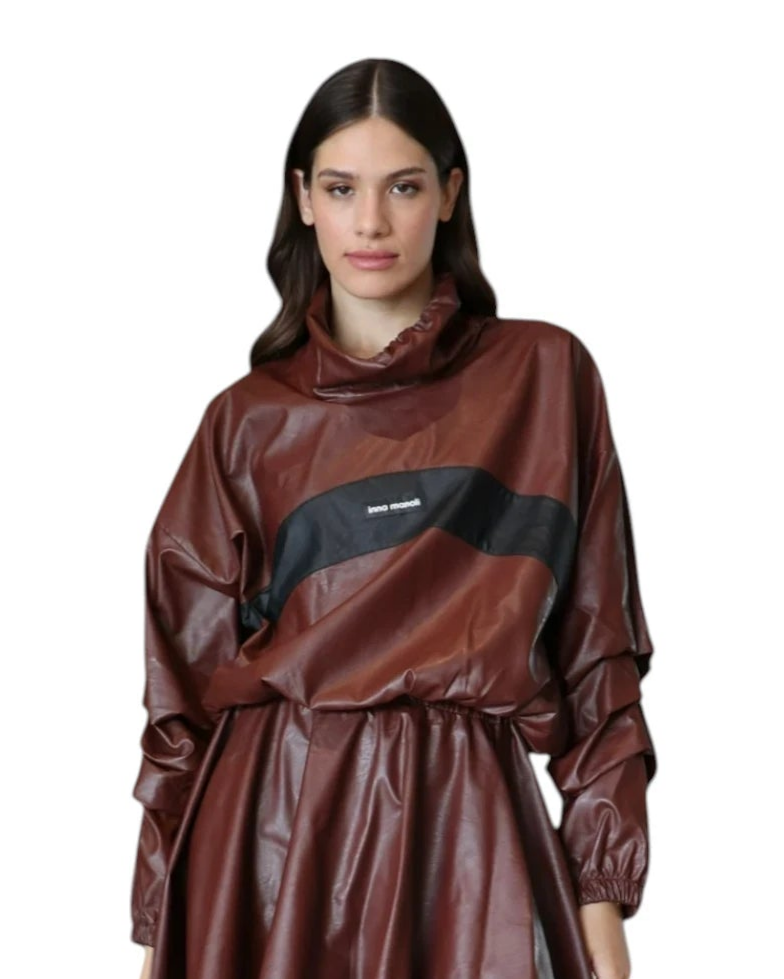 Der Inna Manoli Hoodie Glossy Eco Leather bringt die urbane Ästhetik der Athener Street-Art-Szene in deine Garderobe. Gefertigt aus hochwertigem Eco-Leder, kombiniert er Nachhaltigkeit mit einem glänzenden Finish in tiefem Braun und markantem schwarzen Kontrastdetail.