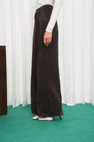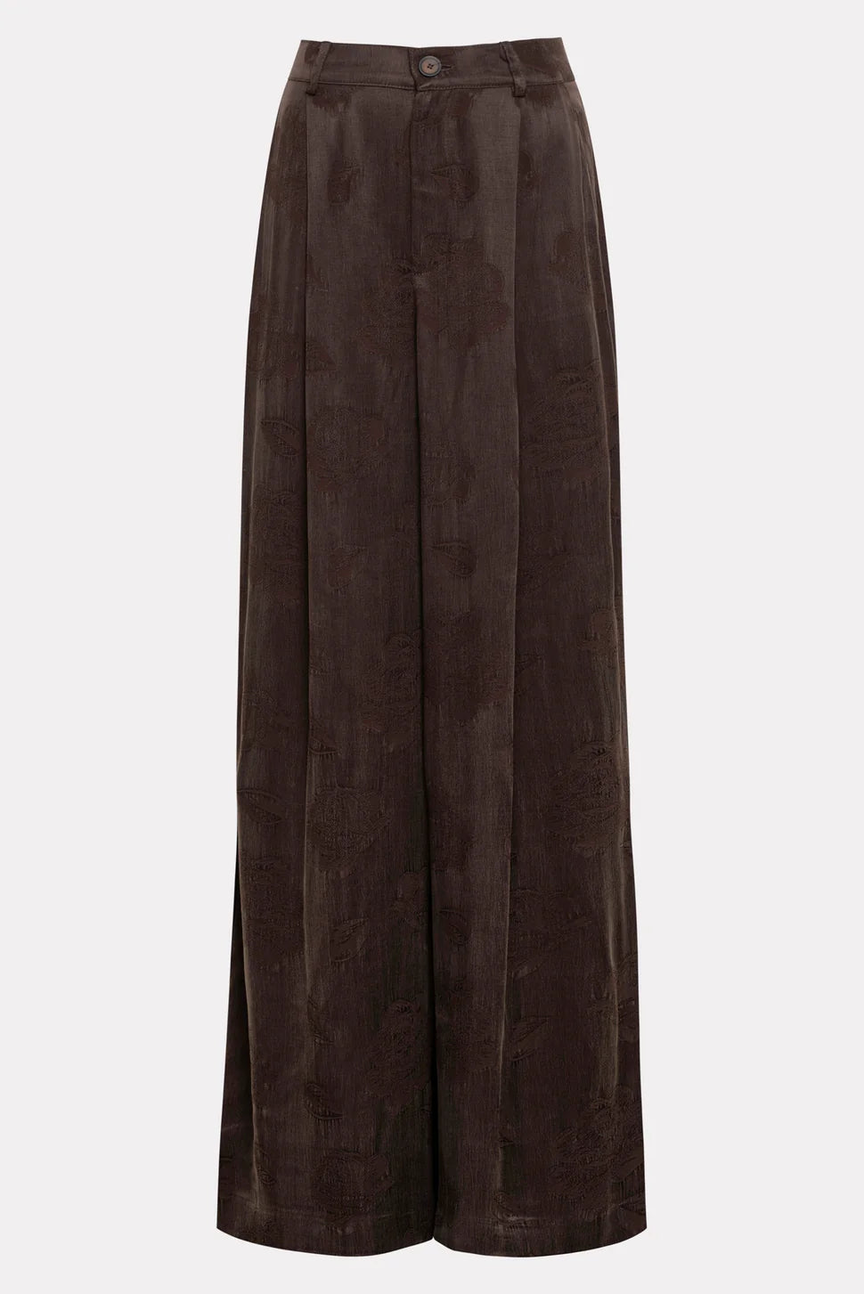 Die Inner Voice Pants sind weite Hosen in dunklem Schokoladenbraun mit dezentem Jacquard-Blumenmuster. Sie haben eine mittelhohe Taille, eine plissierte Vorderseite, Seitentaschen und einen Knopf mit Reißverschluss. Der lange, fließende Schnitt sorgt für Komfort und Stil bei jedem Anlass.