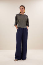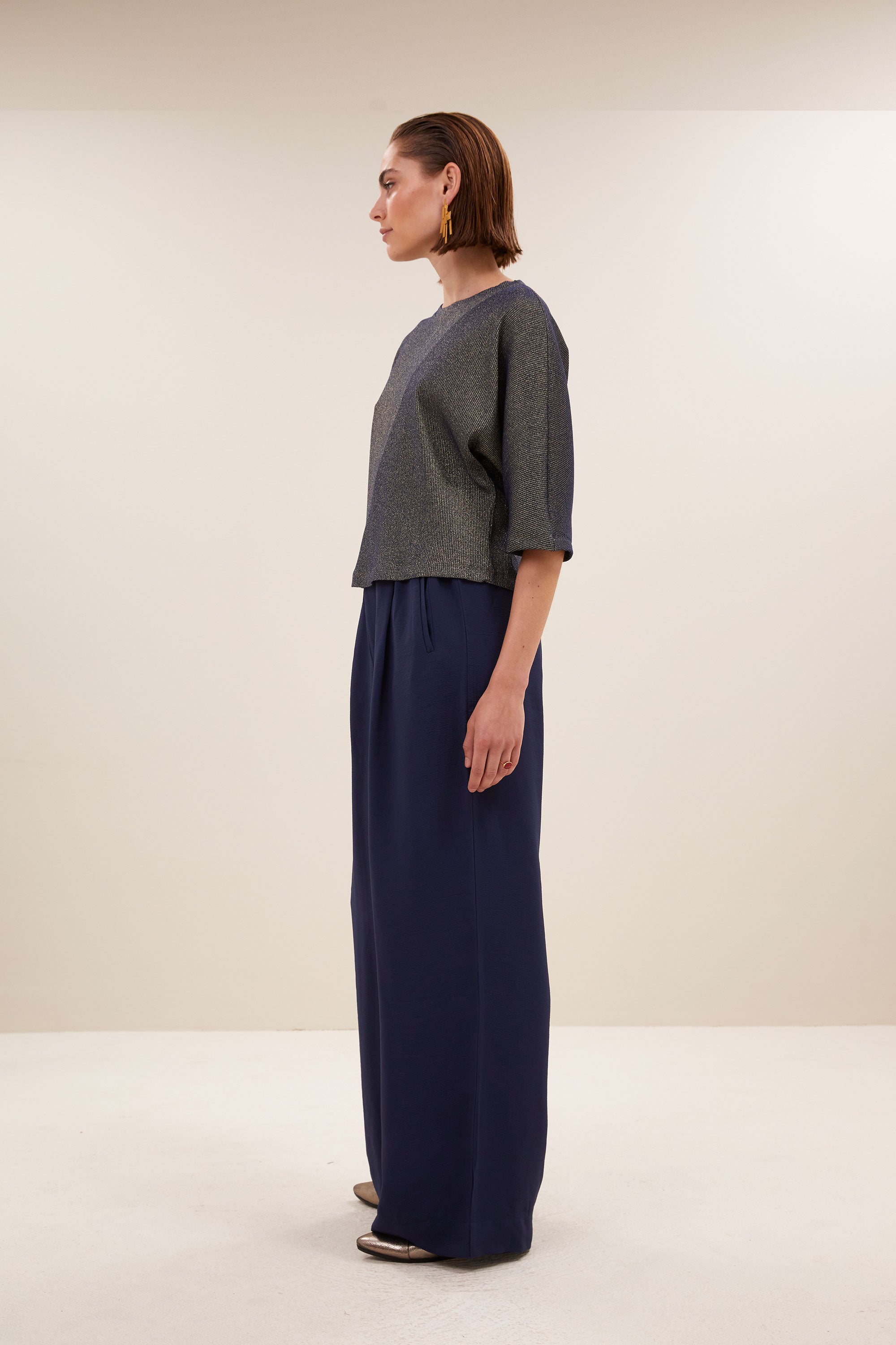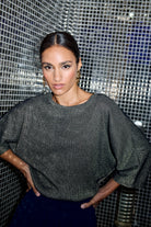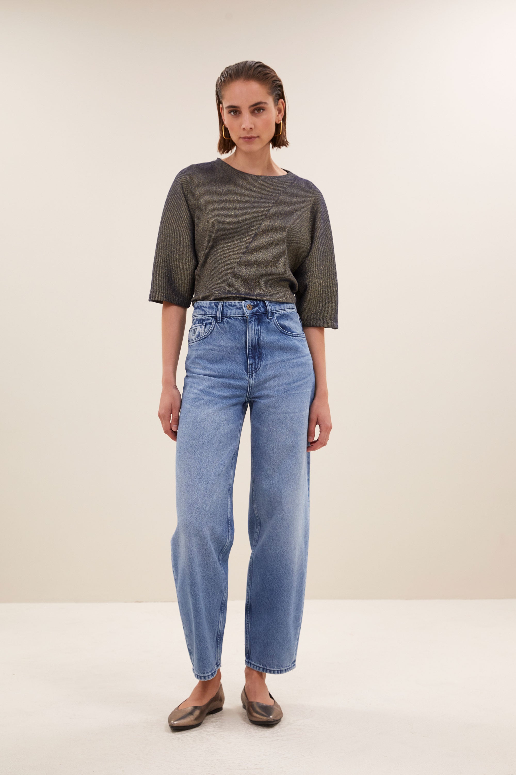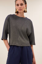 Der subtil eingewebte Lurexfaden verleiht dem Stoff einen feinen, eleganten Schimmer, der jedes Outfit aufwertet – ob tagsüber oder am Abend. Mit seinen ellenbogenlangen Ärmeln, der kurzen Passform und dem runden Halsausschnitt sorgt das Top für einen stilvollen und zugleich entspannten Look.