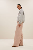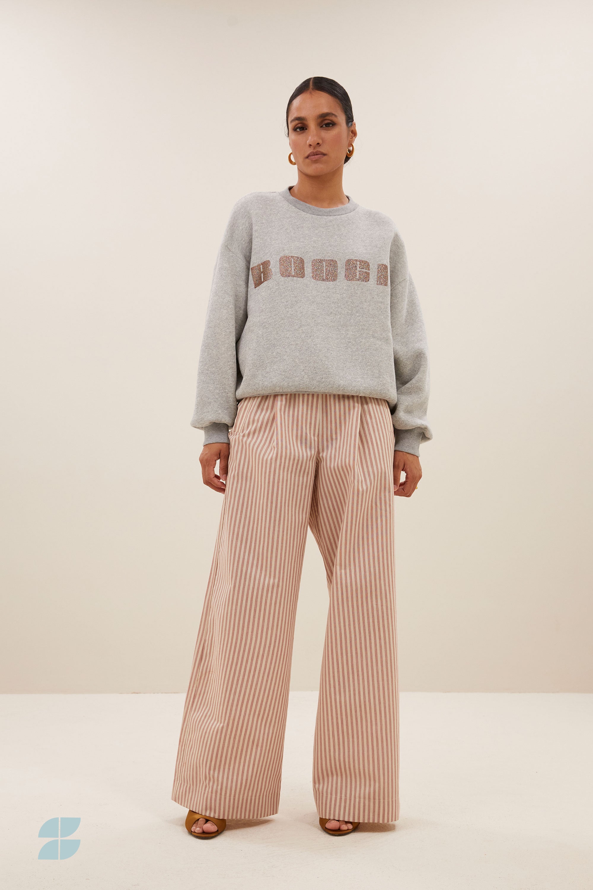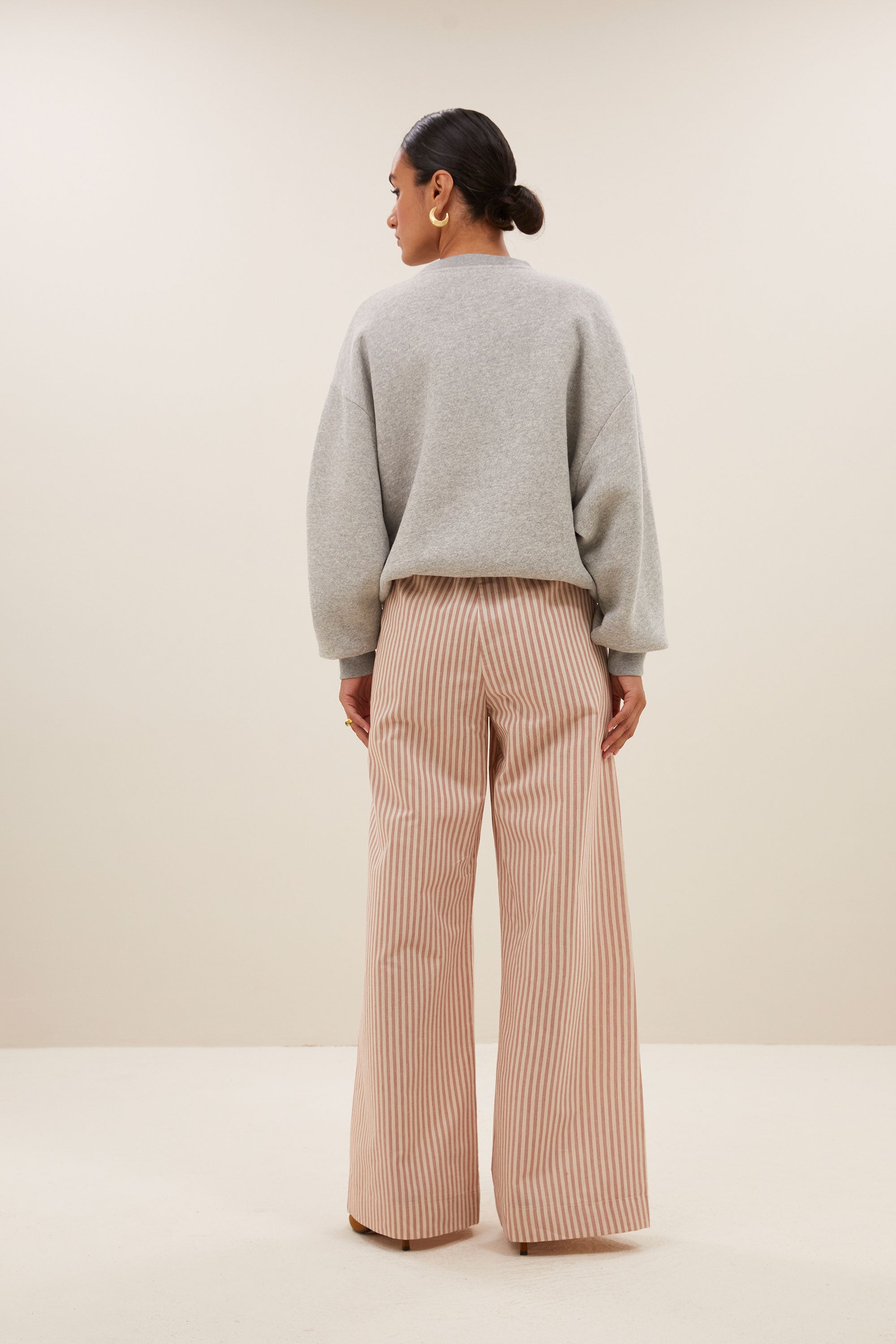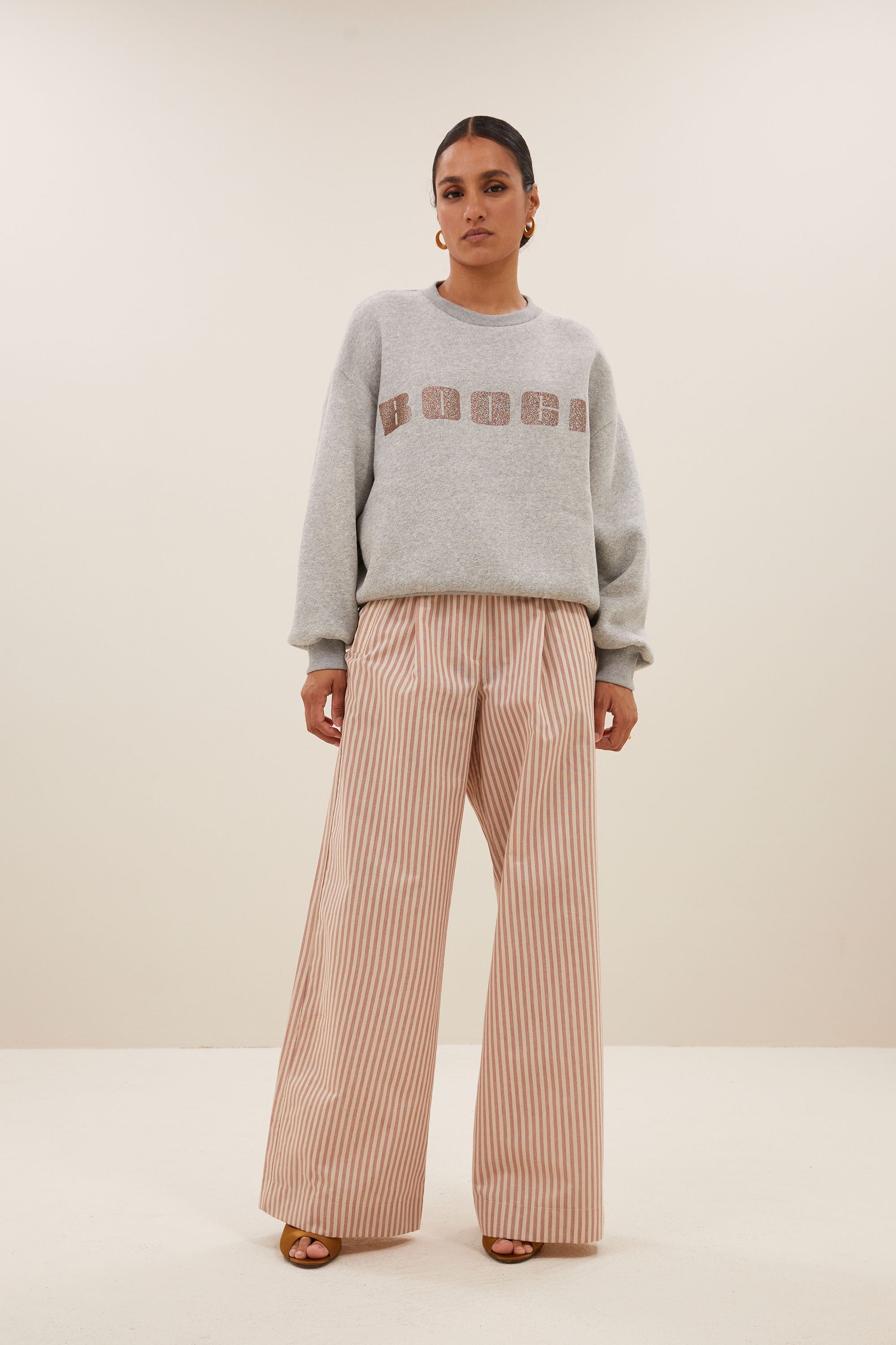 Αυτό το κομψό παντελόνι με λεπτές χάλκινες ρίγες συνδυάζουν κομψότητα και άνεση. Η ψηλόμεση και οι ελαστικές μανσέτες εξασφαλίζουν κολακευτική εφαρμογή, ενώ η μακριά σιλουέτα δίνει μια μοντέρνα εμφάνιση. Ιδανικό για ευέλικτα ρούχα - είτε casual είτε chic.