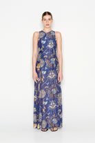 Αυτό το κομψό μάξι φόρεμα, κατασκευασμένο από ελαφρύ, αναπνεύσιμο ύφασμα, κινείται ομαλά σε κάθε βήμα και είναι αέρινο. Η βαθιά μπλε απόχρωση παρέχει τον τέλειο καμβά για το καλλιτεχνικό βοτανικό print σε ζεστό χρυσό, ιβουάρ και απαλό μπλε. Με το ψηλό στρογγυλό ντεκολτέ και το ριχτό κόψιμο σε γραμμή Α, το φόρεμα προσφέρει άνετη εφαρμογή και διαχρονική κομψότητα—ιδανικό για κομψές εμφανίσεις από το πρωί έως το βράδυ.