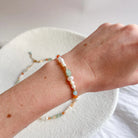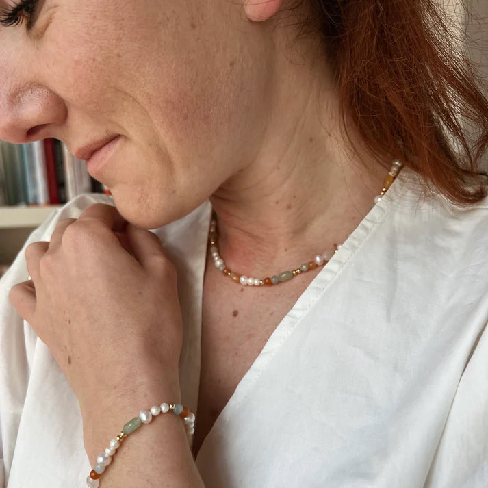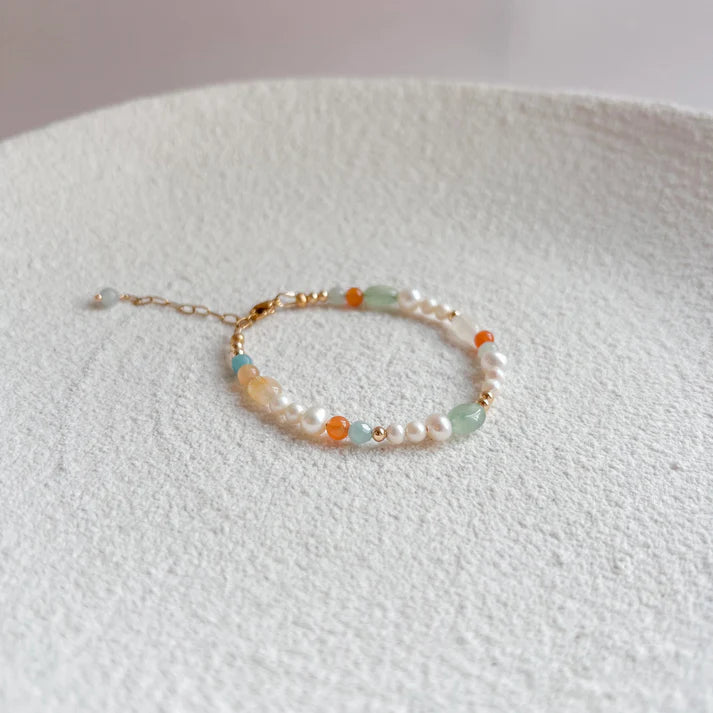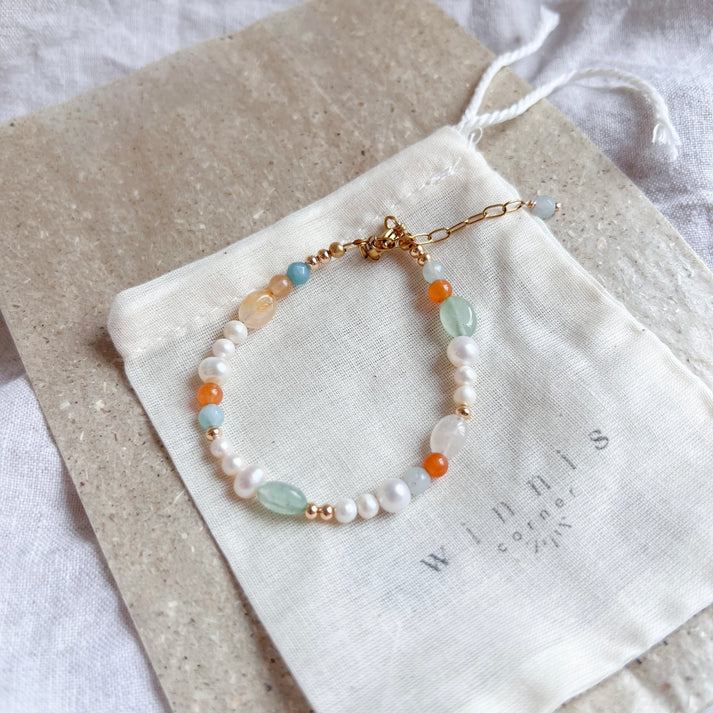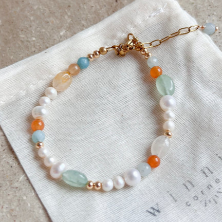 Το χειροποίητο βραχιόλι JUDE της Winnis Corner συνδυάζει φυσικά υλικά με κομψό, διαχρονικό σχέδιο . Ο συνδυασμός από μαργαριτάρια γλυκού νερού, αστραφτερή αβεντουρίνη και φίνες φυσικές πέτρες σε αποχρώσεις του πράσινου, του μπλε και του πορτοκαλί δίνει σε αυτό το κόσμημα μια ιδιαίτερη, ζωηρή πινελιά. Χρυσές ή ασημένιες πινελιές και ένα υψηλής ποιότητας κούμπωμα αστακού με αλυσίδα επέκτασης εξασφαλίζουν τέλεια εφαρμογή.