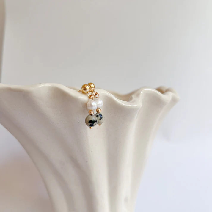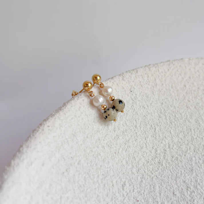 Τα σκουλαρίκια ELLA της Winnis Corner είναι κατασκευασμένα από επιχρυσωμένο ανοξείδωτο ατσάλι 18 καρατίων και είναι διακοσμημένα με δαλματικό ίασπη και μαργαριτάρια γλυκού νερού . Αυτά τα ευαίσθητα σκουλαρίκια συνδυάζουν τη φυσική ομορφιά με βαθύ συμβολισμό. Ο Δαλματικός Jasper είναι γνωστός ως πέτρα ισορροπίας , που προάγει τη γαλήνη και τη χαρά , ενώ οι μοναδικές μαύρες κουκκίδες του αντιπροσωπεύουν την αρμονία του φωτός και της σκιάς . Χειροποίητα με αγάπη και φροντίδα, αυτά τα σκουλαρίκια δίνουν ιδιαίτερο νόημα στην καθημερινότητά σας.