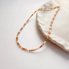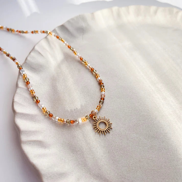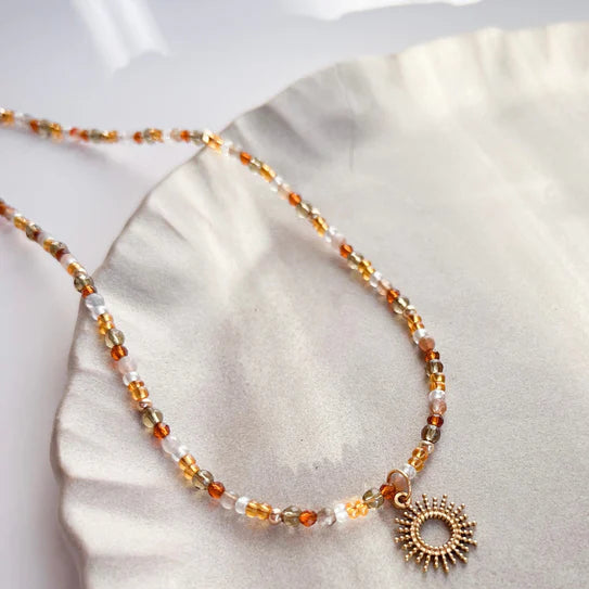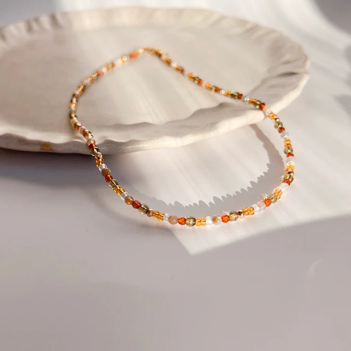 Δώστε στο look σας ξεχωριστή λάμψη με το μαργαριταρένιο κολιέ MAEVE από τη Winnis Corner . Αυτό το χειροποίητο κολιέ είναι κατασκευασμένο από υψηλής ποιότητας γυάλινες χάντρες σε ζεστές αποχρώσεις κεχριμπαριού και χρυσού και ολοκληρώνεται με επιχρυσωμένο κούμπωμα από ανοξείδωτο ατσάλι 18 καρατίων .