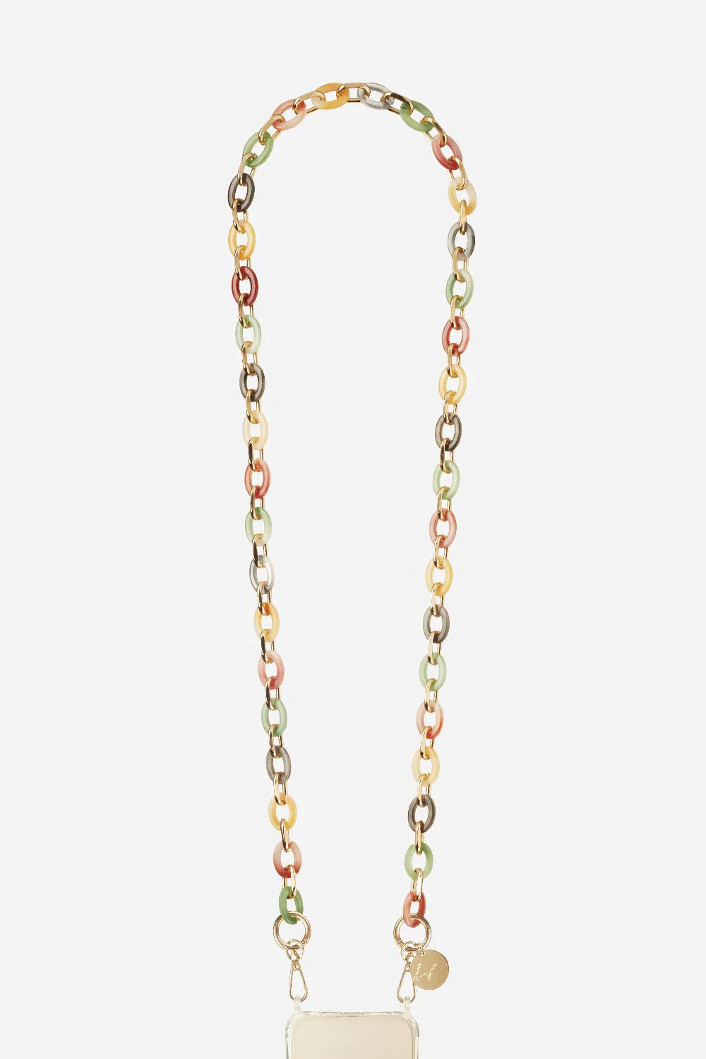 Discover the unique Cassy 120 cm jewelry chain made of resin links with a green and gold gradient! This exclusive chain impresses with its durability and lightness, perfect for everyday use. The rotating carabiners and rings with a gold-colored coating made of stainless steel ensure a luxurious look. With the LaCoqueFrancaise CASSY Multicolor cell phone chain you make a fashion statement and give your outfit that certain something. Get it now and experience stylish elegance!