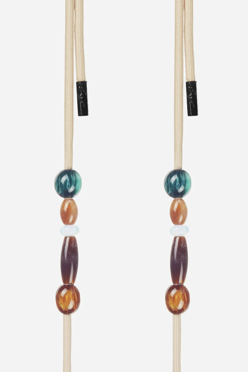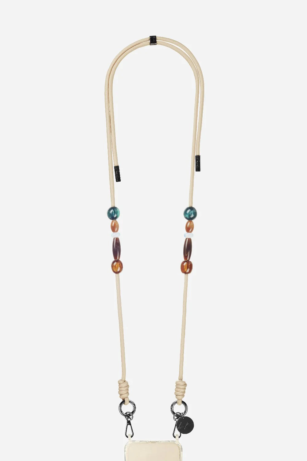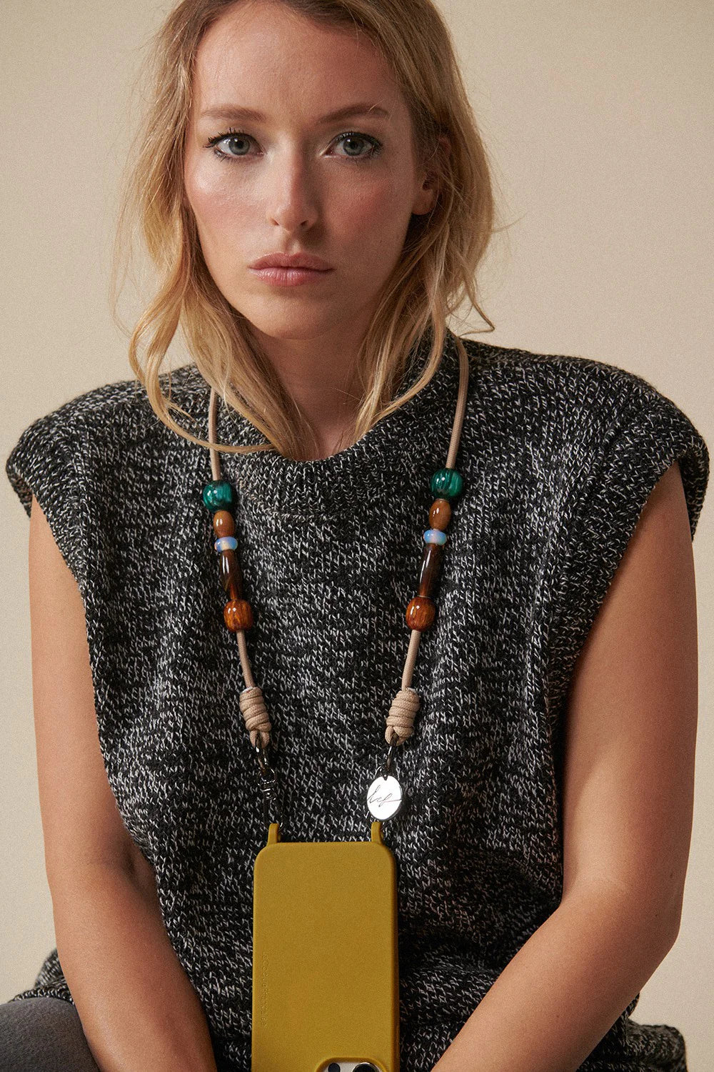 Discover the LaCoqueFrancaise INAYA mobile phone chain in brown & green! This handmade smartphone chain made of beige cotton cord with brown and green beads is not only durable and light, but also a real eye-catcher. The rotating carabiners and rings with black metallized stainless steel coating give the chain a modern touch. Get this stylish accessory now!