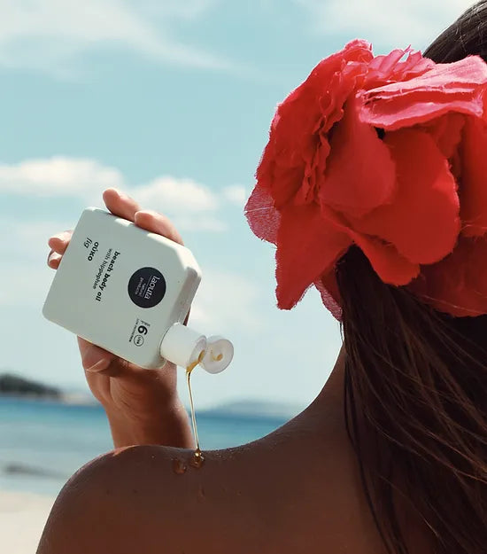 Natural beach body oil with fig and hippophae. Enriched with herbal extracts and nourishing oils, while moisturizing the skin and protecting it from UVA and UVB rays, it provides a vibrant, golden and long-lasting tan. Eco-bottle made from sugar cane with "I am Green" certification + Shake well before use + Certified Vegan | GMO Free | Cruelty Free