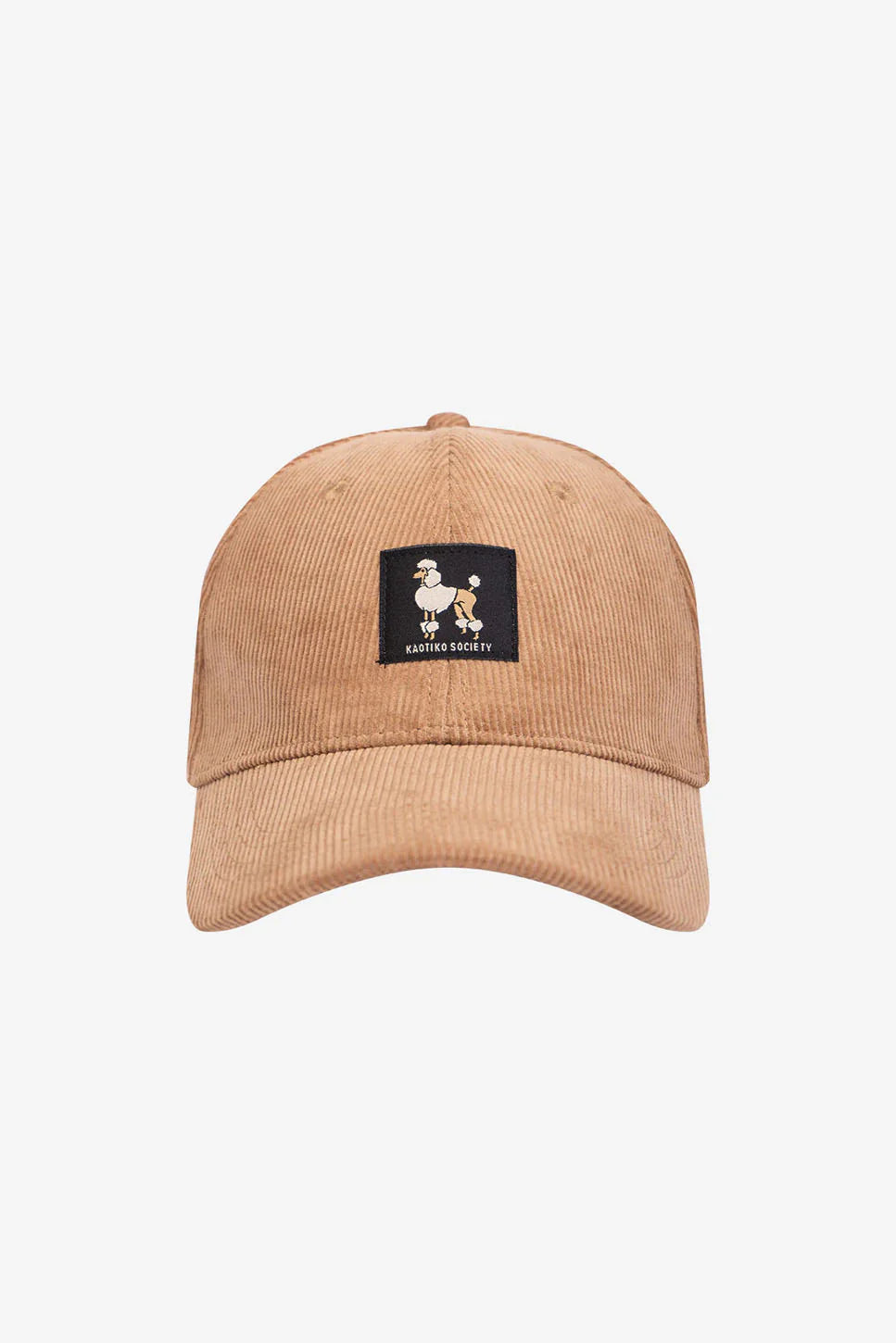 Der samtige Cordstoff verleiht der Cap eine besonders angenehme Haptik, während das verstellbare Metallschnallenband für optimalen Sitz sorgt. Auf der Vorderseite ist das Kaotiko Society Patch mit Pudel-Motiv ein echter Blickfang und unterstreicht den urbanen, nachhaltigen Look.