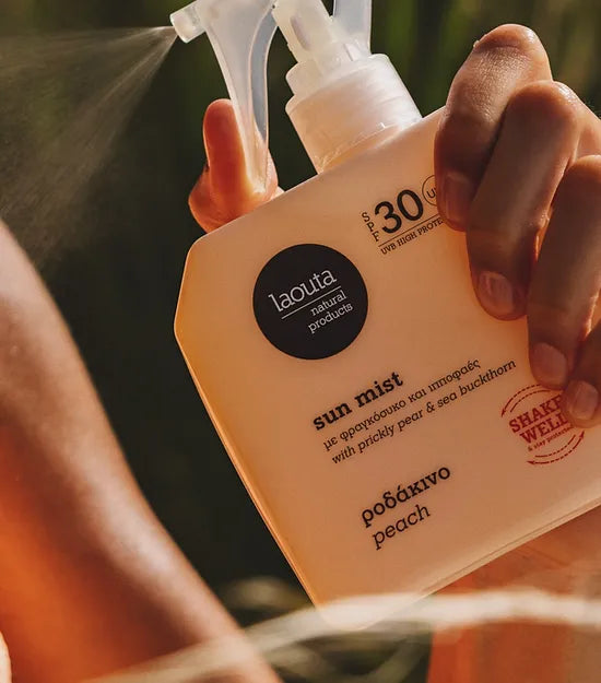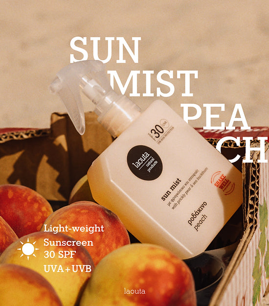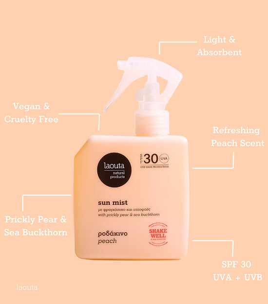 LAOUTA Peach | Sun Mist SPF 30 – Hochwirksames Sonnenwasser mit Pfirsich, Kaktusfeige und Sanddorn