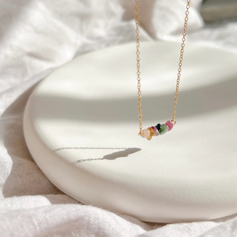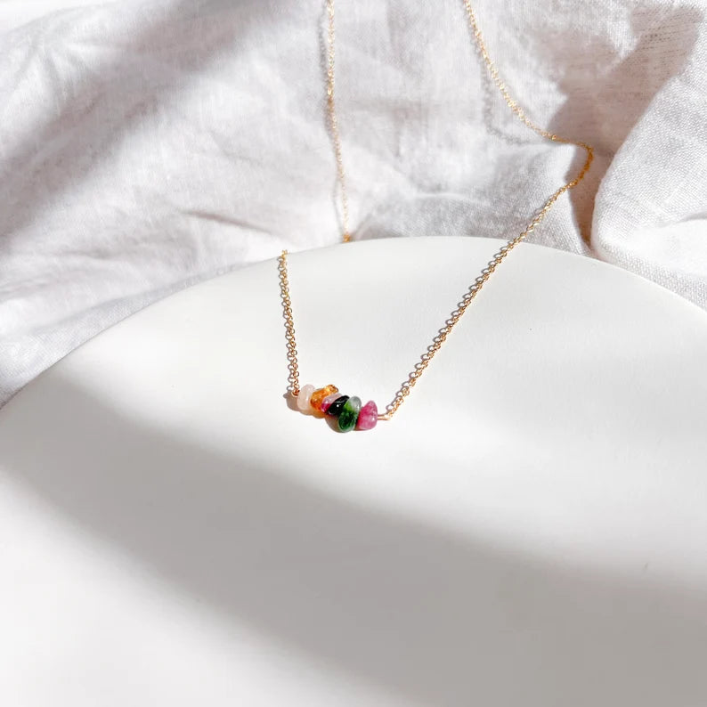 Entdecke die zarte Edelstein-Kette aus Turmalin, das perfekte Accessoire für Alltag und besondere Anlässe. Diese Kette besteht aus hochwertigem, 18K vergoldetem Edelstahl, verziert mit wunderschönen Turmalin-Edelsteinen, die jedem Outfit eine elegante Note verleihen.
